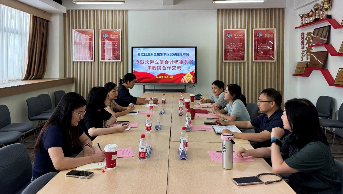 10月17日下午,立信会计师事务所浙江分所人力资源部经理王静、函证中心主管吕楠、人力资源部副经理熊月圆及罗婷一行到访我院,与数字财经学院院长王茜、副院长单松、大数据与会计专业主管殷慧敏及骨干教师宋洁共同开展校企合作交流。会议由院长王茜主持。